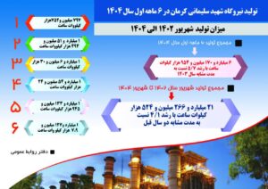 رضا کاویانی مدیر عامل شرکت مدیریت تولید برق کرمان با اعلام این خبر اظهار داشت: نیروگاه شهید سلیمانی در نیمه نخست امسال موفق به تولید بیش از ۶ میلیارد و ۱۷۰ میلیون کیلوواتساعت برق شد که این میزان نسبت به سال گذشته، ۵/۷ درصد رشد داشته است که از این میزان ۳۷ درصد در واحدهای بخار و ۶۳ درصد در واحد های گاز تولید شده است. وی ادامه داد: این دستاورد در شرایطی بهدست آمده که مصرف برق کشور روندی افزایشی دارد و پایداری شبکه از اهمیت بالایی برخوردار است.