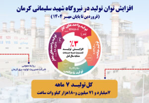 رضا کاویانی با اعلام این خبر گفت: از ابتدای فروردین تا پایان مهرماه امسال، مجموع تولید نیروگاه شهید سلیمانی کرمان به ۷ میلیارد و ۷۱ میلیون و ۱۸۰ کیلو وات ساعت رسیده است که از این میزان، ۶۳ درصد توسط واحدهای گازی و ۳۷ درصد توسط واحدهای بخار تولید و به شبکه سراسری برق کشور تزریق شده است.